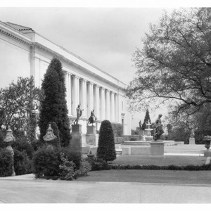 A view of the southwest corner of the library building. The pathway to the building is flanked by two sculptures of vases on pedestals, while in front of the entrance there are two statues.