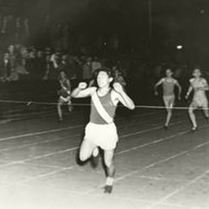 Photo--Black and white: Analy High School Tigers track circa 1960s. Runner Phil Ito breaking the tape at a night time track meet.