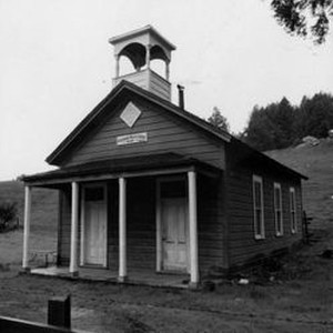 Photo--black and white: Coleman Valley School, established 1864. Front view of the school with two front doors (one for girls and one for boys) and school bell cupola.