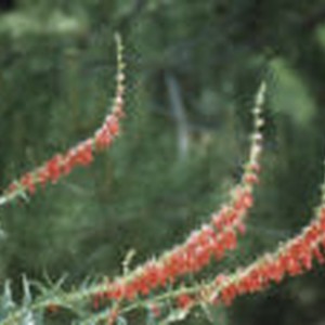 Close-up of tall green stems with multiple leaves topped with red flowers.