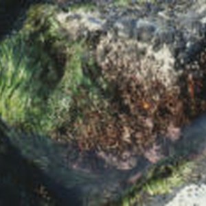 Rock in a tide pool covered with kelp and red algae.