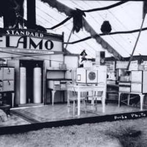 Photo--black and white: Gravenstein Apple Show display, about 1930s of Standard Oil's Flamo propane products. On display in a kitchen setting are stoves, ranges and heaters for home use. "Borba Photo" is hand scratched at the bottom right.