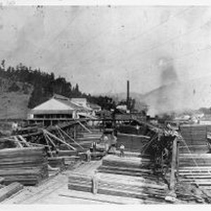 Photo--black and white: Employees of Duncans Mills stacking milled lumber at Duncans Mills 1923. Photo identified by Ralph Sturgeon as "Logging 100."