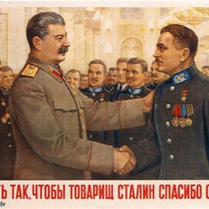 Soviet poster. Caption reads, "Работать так, чтобы товарищ Сталин спасибо сказал! / Rabotat' tak, chtoby tovarishch Stalin spasibo skazal", meaning, "Work hard and comrade Stalin will thank you!". [Description English/roman)]