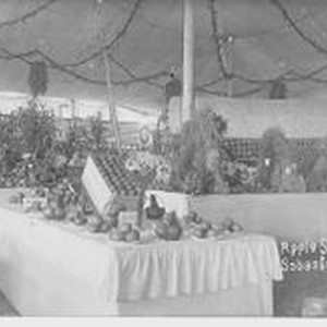 Postcard--black and white: A 1914 Gravenstein Apple Show exhibit of tables with displays of apples.