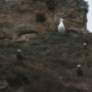 Tufted puffins standing on a cliff.