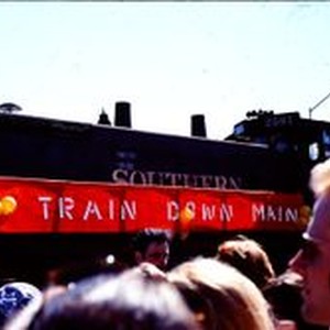 Print, color: Apple Blossom Parade, annual Sebastopol spring event. The Southern Pacific train with "Our Train Down Main" banner. Circa 1970s