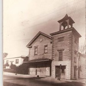 Photo--black and white; Sebastopol City Hall and Firehouse (with belltower) located at the corner of Bodega Avenue and Edman Way, about 1927. Currently (2009) the location of Sebastopol's City Hall on Bodega Ave. To the left is the original Carnegie Library built in 1917.