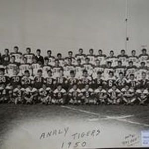 Photo--black and white: Analy High School Tigers football team of fall 1950 taken February 1951 "under the lights" at Analy Field. Photo by "Kay Dee" Reynolds.