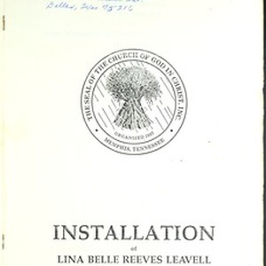 Installation service program, Lina Belle Leavell, Smith Temple Church of God in Christ, Tyler, Texas, 1991 October 19. Partial copy containing only 12 of 21 pages. [Description English/roman)]