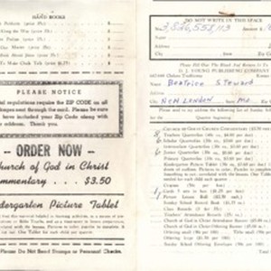 Order Form (Beatrice Steward) requesting Sunday School Literature from D.J. Young Publishing Company, 1970 July 22. [Description English/roman)]