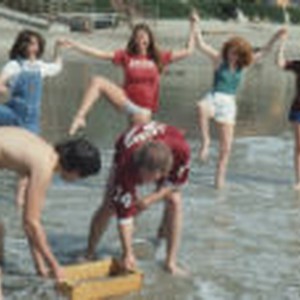 Students John Leiser,and Pat Flynn dig for sand crabs at Sugarloaf Point while Terril Jones, Judy King, Patty Sutton, Sally Rimkeit, and Anna Nelson play around behind them.