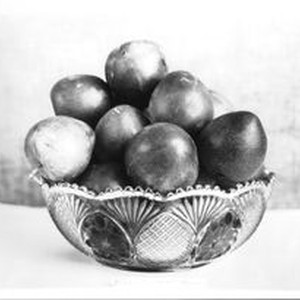 Photo--black and white: Glass bowl with plums. Burbank "Elephant Heart" Plum. Labeled: "K-22 "Elephant Heart Aug. 1929."