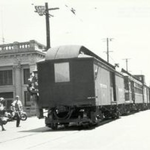 Photo--black and white: Last train of the P&SR Railway from the Forestville line to Sebastopol hauling passenger cars to Petaluma on Main Street Sebastopol June 30, 1932. With the February 26, 1932 takeover by Southern Pacific--owned by Northwestern Pacific Railroad, passenger service of the P&SR was not to last much longer.