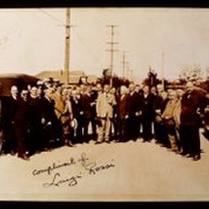 Slide--black and white: A group of men photographed with Luther Burbank (white haired man in center). The photo is signed "Complements of Luigi Rossi'. Circa 1920