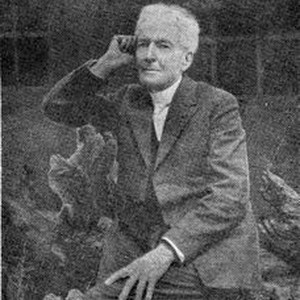 Luther Burbank in his later years, about 1920, seated on what appears to be the stump of an up-ended tree.