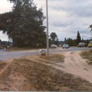 Photo--color: The Hallberg Apple Farm roadside stand sign along Gravenstein Highway North (Highway 116) 1979.
