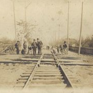 Photo--black and white: The P&SR Railway tracks cross the California Northwestern tracks on Sebastopol Avenue, March 2, 1905.