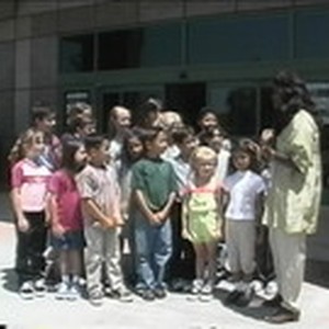 Mrs. Hunts class from New Life Christian School take a tour of the Corona Public Library with John "Mr. Z" Zickefoose and library mascot Belinda Bear.
