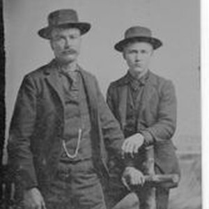 Photo--black and white: Unidentified man and boy circa 1870. Possibly friend or family member of Otis Allen family. Original photo is a tintype.