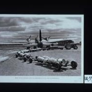 Bestemd voor den nachtelijken aanval - een bommenwerper van de R.A.F. neemt zijn bommenlading in