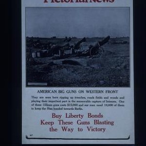 American big guns on the Western front. They are seen here ripping up trenches, roads, fields and woods, and playing their important part in the memorable capture of Soissons. One of these 155mm guns cost $15,000 and our men need 10,000 of them to keep the Hun headed towards Berlin. Buy Liberty bonds. Keep these guns blasting the way to victory