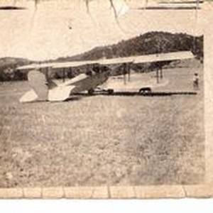 Photo--black and white: Biplane in grassy field -Sebastopol Airport. Unidentified man on right.