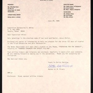 Willie Mae Rivers (Church of God in Christ), P.O. Box 157, Goose Creek, South Carolina, letter, 1994 June 28, to Earnestine S. White (Church of God in Christ), P.O. Box 3832, Temple, Texas. Regarding the Triad convention. [Description English/roman)]