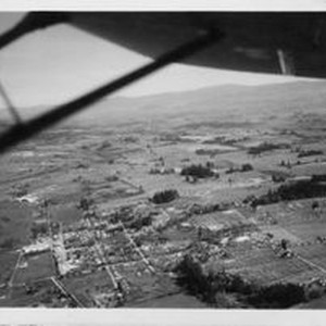 Photo--Black and white: Aerial view of Graton taken from the south looking north 1950. Graton is seen in the middle of the photo. Hallberg cannery is seen at the bottom left (L-shaped white buildings).