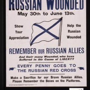 The Lord Mayor's appeal for the Russian Wounded ... Remember our Russian Allies ... Every penny goes to the Russian Red Cross. Make a sacrifice for our brave Russian Allies. Please remember the boxes on the platforms