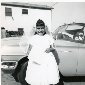 Standing in St. Lucy's parking lot next to a Chevrolet Bel Air, Susan Martinez wears a veil and dress on First Communion day, City Terrace, Spring 1963.