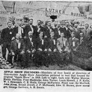 Photo--black and white: The 1910 Gravenstein Apple Show board of directors pictured in the tent that housed the Apple Show. Back row, L-R: Walter Monroe, Hardy Harbine, Fred Maddocks, John Turner, Louis Howell, J. P. Kelly, W. I. Newcomb, C. E. Hotle, George McFarlane. Front row, L-R: Ed Morford, John Alves, Ernest Jewell, J. P. McDonald, Edw. H. Brown -show manager, George Sanborn and A. B. Swain.