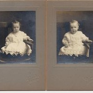 Photo--sepia, matted: Two poses of Lester E. Sharp at 13 months old in 1913. Lester has a twin named Chester. Clench Studio, Sebastopol .
