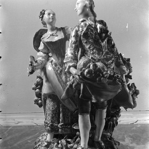 Allegorical porcelain figures of Summer and Autumn in the art collection in the Huntington residence. Label accompanying photograph in album reads "HEH 22 Chelsea porcelain. "Summer," on left; "Autumn," on right. Huntington Art Gallery."