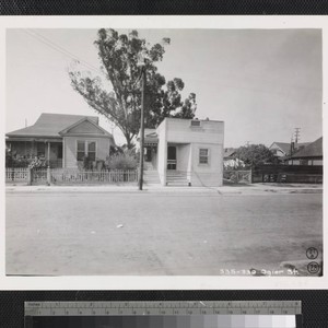 View of houses with fenced-in yards and trees on Ogier Street near Old Chinatown in Los Angeles.