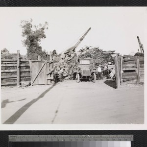 View of a truck and two men in front of a pile of refuse and scrap metal on Jeanette Street near Old Chinatown in Los Angeles. Two cranes are in the background. Title provided by cataloger; title illegible.