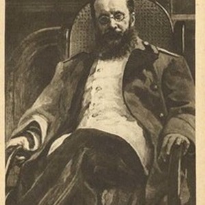 A poster featuring a black-and-white copy of the portrait of Russian composer Cesar Antonovich Cui (1835-1918) by Ilya Repin. [Description English/roman)]