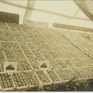 Postcard--black and white photo--Gravenstein Apple Show 1910--Display of boxes of apples of George Ross, Forestville.~The first Sebastopol Apple Show was held in a tent across from the Petaluma & Santa Rosa Depot in August, 1910 and promoted local fruit growers and their products.