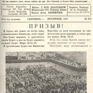 The Christian Herald was an informational organ of the Union of Pentecostal churches of "Assemblies of God" in South America. The journal was founded in August 1937 at the founding meeting of the Slavic Pentecostal churches of South America. Believers from Argentina, Paraguay, Uruguay and Brazil were present at the meeting. The purpose of the journal was to "carry unity and communication of the Spirit to the midst of believers in full Gospel". The journal united Pentecostal churches and became a link which connected believers scattered all over the world. Thus, letters of Christians of Evangelical faith from Germany, Belgium, France, the Netherlands, Canada, the United States, Uruguay, Paraguay, the Philippines, China, Australia and other countries were published in the journal journal. The first issue was published in Russia in October 1937. Subsequently, the journal spread to 40 countries where the Slavic diaspora lived. The headquarters of the journal was located in Buenos Aires. Juan Zub-Zolotarow was responsible for the journal. He was a permanent editor for 42 years. The journal was published for offerings of believers. Spiritually-edifying and theological articles of Donald Gee, Alfred Goets, R. Bratslavsky, N. Vodnevsky, D. Bespalov were published in the journal. On the last pages, as a rule, information from local churches and the mission and evangelical fields of North and South America, Canada, Africa, Australia, India, Europe and China was published. Thus the activity of such evangelists as Oral Roberts, Billy Graham, T. Giks, and William Brankham was reported in detail. [Description English/roman)] Христианский Вестник -- информационный орган Союза Пятидесятнических церквей «Собраний Божиих» Южной Америке. Журнал был основан в августе 1937 года на учредительном собрании славянских пятидесятнических церквей Южной Америки. На этом съезде присутствовали верующие с Аргентины, Парагвая, Уругвая и Бразилии. Цель журнала: «Нести единство и общение духа между верующими в полное Евангелие». Журнал объединил вокруг себя пятидесятнические церкви и стал как-бы связующим звеном между верующими, рассеянными по всему миру, публикуя письма христиан веры евангельской-славян из Германии, Бельгии, Франции, Голландии, Канады, Соединенных Штатов, Уругвая, Парагвая, Филиппин, Китая, Австралии и других стран. Первый номер журнала, издававшегося на русском языке, вышел в октябре 1937 года. Впоследствии журнал распространялся более чем в 40 странах, где проживала славянская диаспора. Штаб квартира журнала находилась в Буэнос-Айресе. Ответственным за журнал был назначен И.Зуб-Золоторев, который и был бессменным редактором на протяжении 42-х лет. Издавался журнал на добровольные пожертвования верующих. В журнале печатались духовно-назидательные и богословские статьи Дональда Джи, Альфреда Гоетца, Р.Брацлавского, Н.Водневского, Д.Беспалова. На последних страницах, как правило, публиковались информационные сообщения от поместных церквей и евангелизационных и миссионерских полей Северной и Южной Америки, Канады, Африки, Австралии, Индии, Европы и Китая. Так освещалась подробно деятельность евангелистов: Орала Робертса, Билли Грэма, Т.Гикса, Уилльяма Бранхама. [Description (original non-English/roman language/script)]