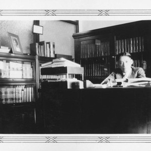 In this photograph Y. C. Hong is sitting in his law office at 74 1/2 North Alameda St. in Los Angeles. Hong family papers. The Huntington Library, San Marino, CA.