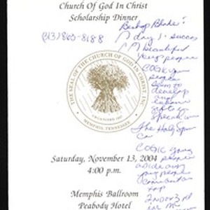 Program for the 35th Annual Church of God in Christ (COGIC) scholarship dinner, Peabody Hotel, Memphis, Tennessee, 2004 November 13. Handwritten notes are on the program. [Description English/roman)]