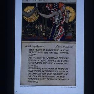 "I shall expect every man who is not a slacker to bne at my side throughout this great enterprise." Woodrow Wilson. To all employees: A call to action! This plant is executing a contract for the United States Navy. As patriotic Americans you can render a great service by doing your work promptly and doing it well. Remember: your work is an important factor in this fight for freedom. On land and sea our soldiers and sailors are depending on you to do your part in the winning of the war