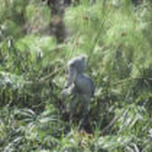 Close-up of a stork in the middle of green vegetation.