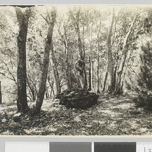 Grave site of Jack London in grove of trees with wreath hanging above. Title and date transcribed from envelope. Verso of photo reads: "Jack London's grave at Glen Ellen ranch.