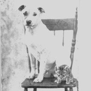 Photo--black and white: Photo of a Dog and small kitten on a wooden chair. Caption: "Mayor and mascott of Graton, Cal." Wayne Photo