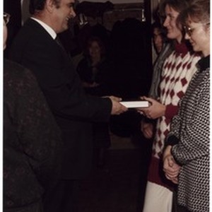 Fotografija Mihaela Kuzmiča kako novokrštenoj djevojci pruža knjigu kao poklon. [Description (original non-English/roman language/script)] Photograph of Mihael Kuzmič presenting a newly baptized young woman with a book as a gift. [Description English/roman)]