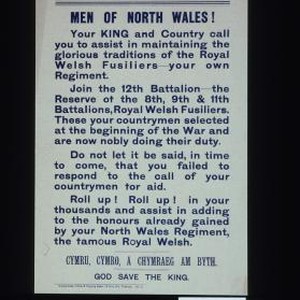 Men of North Wales. Your King and country call you to assist in maintaining the glorious traditions of the Royal Welsh Fusiliers, your own Regiment. Join the 12th Battalion, the Reserve of the 8th,9th & 11th Battalions, Royal Welsh Fusiliers ... Cymru, cymro, a chymraeg am byth. God save the King