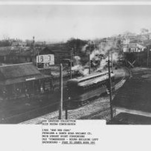 Photo--black and white: The L-shaped Petaluma & Santa Rosa Railway Powerhouse in left background, built circa 1904 from Stony Point Quarry rock. The Powerhouse served as the freight depot and housed the step-down transformers for the Sebastopol substation for the P&SR electric railway. In the left foreground is the original wooden Sebastopol depot station. In front of the depot is one of "The Red Cars." Fare to Santa Rosa was 10 cents. Photo facing south easterly, with north and westerly facades visible. The Powerhouse was later named the Hogan Building. The train tracks seen in the easterly direction comprise the present day (2009) Joe Rodota Trail.