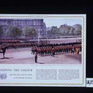 Against the plane trees of St. James's Park the ceremony gives a brilliant splash of colour to the London scene