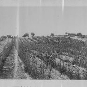 Photo, black and white: Luther Burbank's Gold Ridge Experiment Farm in Sebastopol with rows of lilies. Orchard trees can be seen in distance.